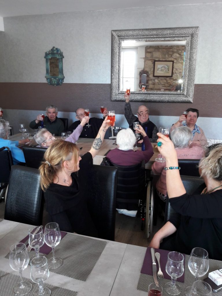 Aujourd’hui nous sommes allés manger au restaurant du village « Le Léopard d’Or ». Nous étions une vingtaine, nous avons partagé un moment très agréable et nous nous sommes régalés. Menu: Cassolette (gambas, sèche, saumon), moules à la crème, poulet fermier, gratin dauphinois, moelleux au chocolat)